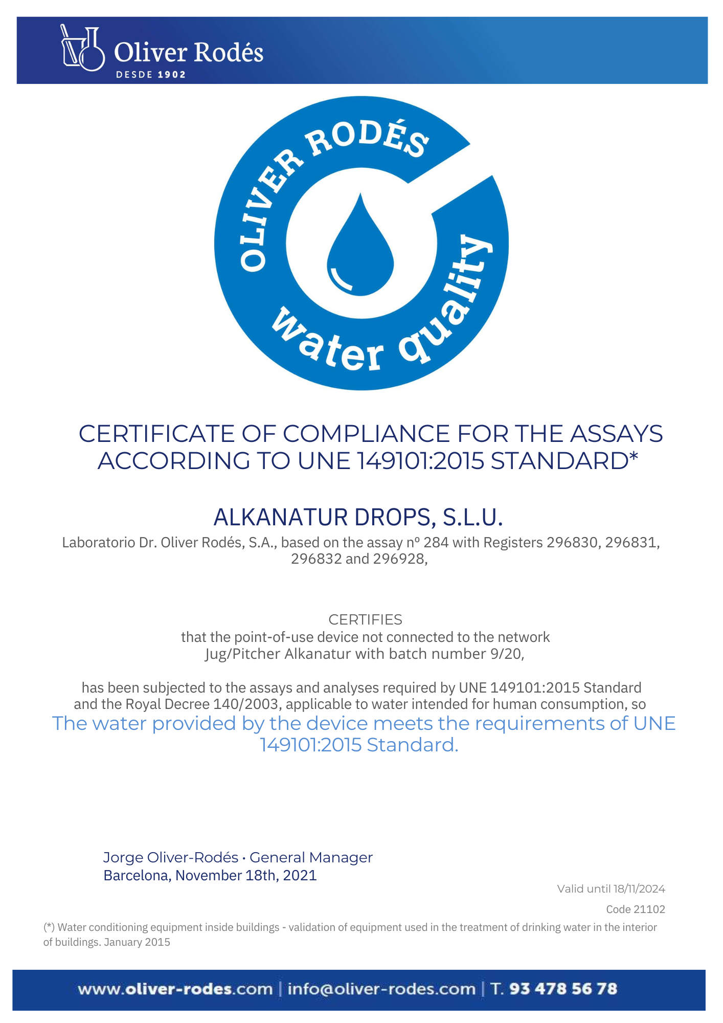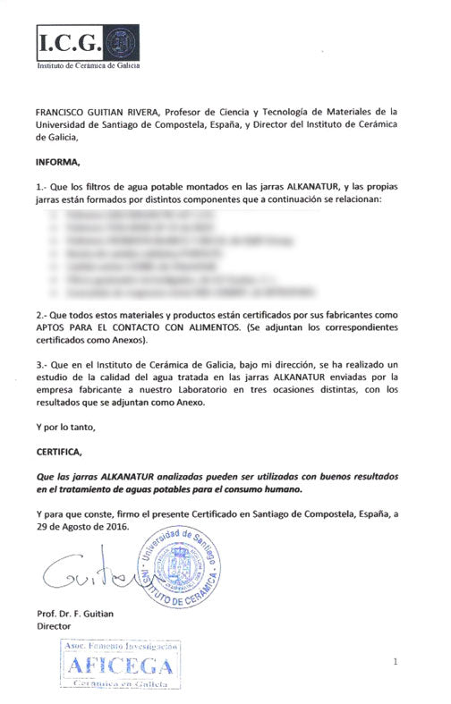 L'Institut de la Céramique de Galice certifie que le pot et les filtres Alkanatur Drops sont adaptés au contact alimentaire (eau).