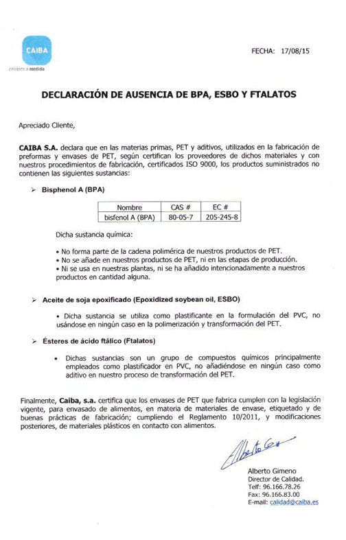Document certifiant que les bouteilles Alkanatur sont exemptes de BPA (Bisphénol A), d'ESBO et de phtalates et adaptées à une utilisation avec de l'eau et d'autres liquides destinés à la consommation humaine.
