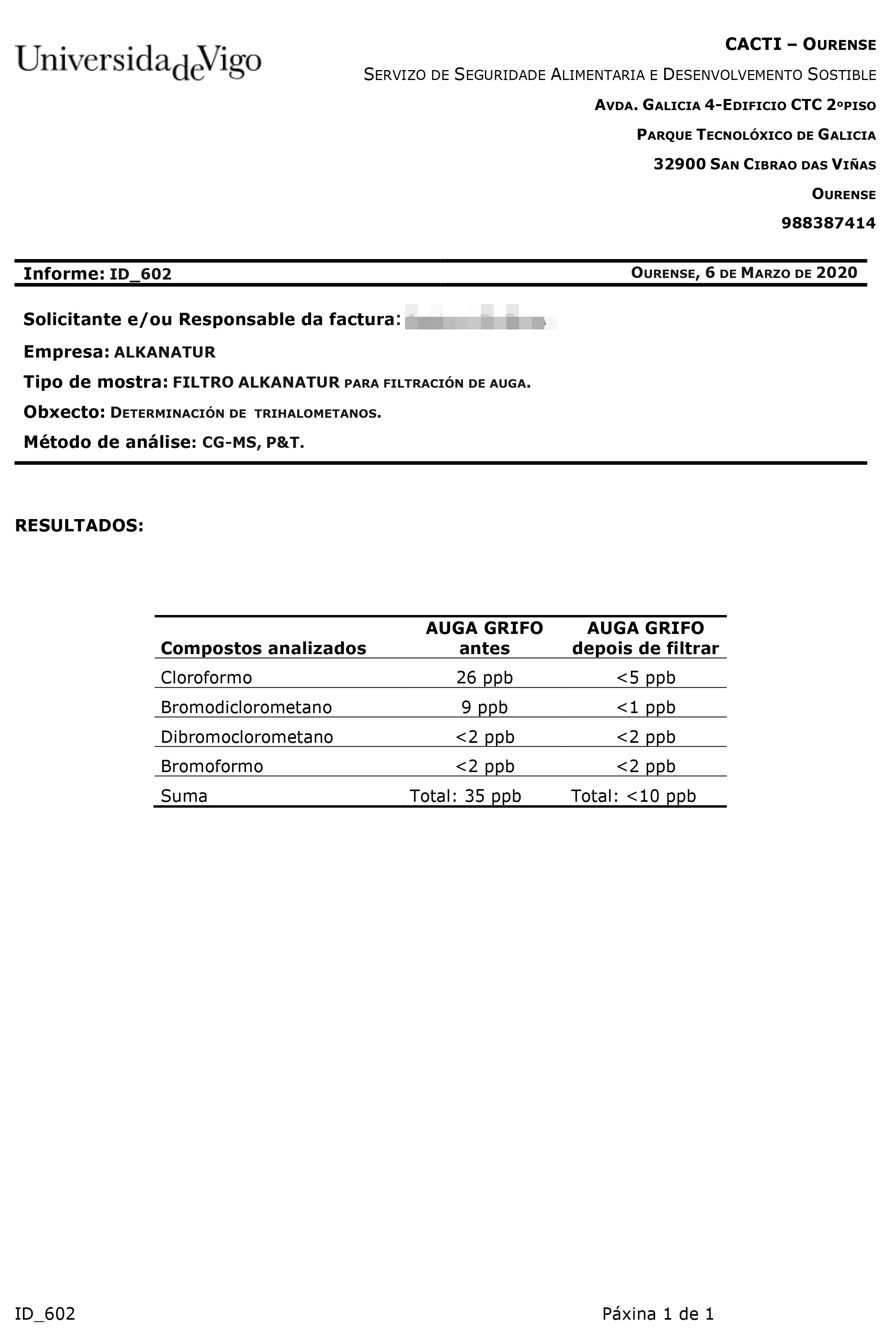 Analyse fournie par CACTI (Service de Sécurité Alimentaire de l'Université de Vigo) où il est démontré que la cruche Alkanatur élimine les trihalométhanes de l'eau.