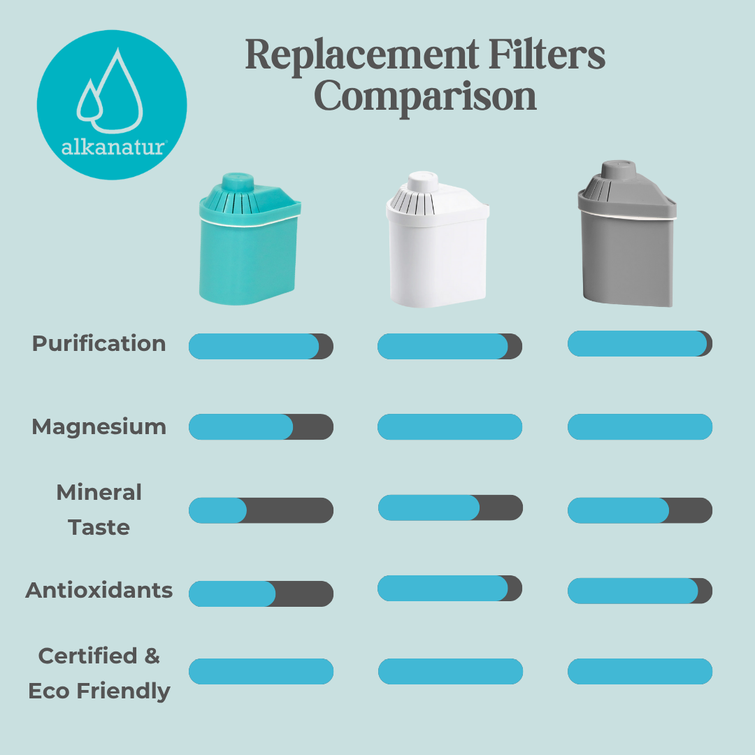 SANS SODIUM AJOUTÉ : Le seul filtre qui purifie et alcalinise sans ajouter de sodium. Le pichet Alkanatur utilise un filtre biocéramique actif de haute qualité qui transforme l'eau du robinet ordinaire en eau purifiée alcaline et ionisée avec un pH de 8,5 à 9,5.