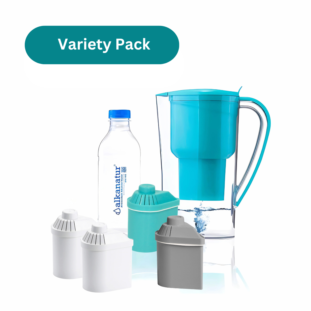 Améliorez votre hydratation grâce à nos filtres à eau révolutionnaires. Envie de tester nos filtres classiques, nos filtres à faible émission de magnésium et nos filtres à zéolite ? Ce pack varié est fait pour vous. Ces 3 filtres de rechange sont compatibles avec la carafe à eau Alkanatur. Vous recevrez un filtre blanc, un filtre vert et un filtre gris. Nos filtres ne se contentent pas de purifier l'eau du robinet : ils alcalinisent, minéralisent, ionisent et hydrogénent également l'eau.