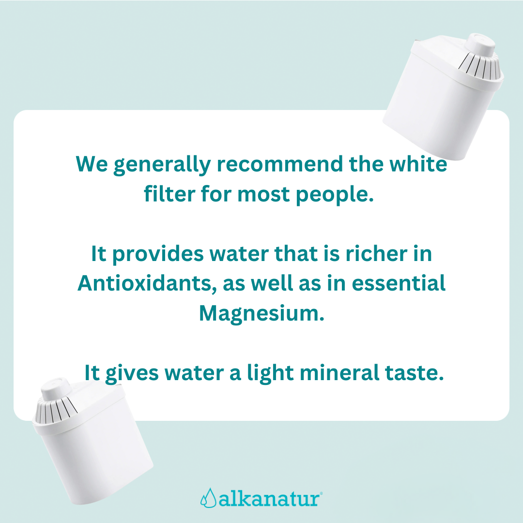 Notre technologie brevetée confère à l'eau un potentiel antioxydant qui contribue à lutter contre les radicaux libres. Pour une saveur supérieure, nos filtres blancs ajoutent du magnésium essentiel, à raison de 18 mg par litre, vous offrant ainsi une eau équilibrée et riche en antioxydants. Si vous constatez une accumulation excessive de minéraux , optez pour le filtre vert. Ce dernier libère beaucoup moins de magnésium, idéal pour ceux qui abandonnent l'eau en bouteille ou qui vivent dans des régions où l'eau est très dure.