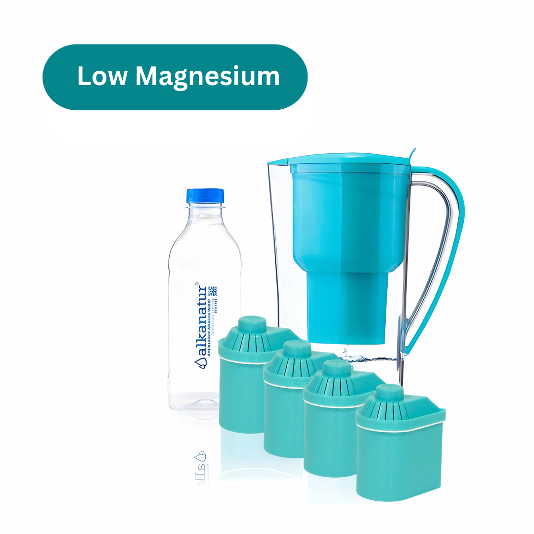 Améliorez votre hydratation grâce à notre carafe révolutionnaire. Cette version est équipée de notre filtre vert, différent de notre filtre standard, et est conçue pour les régions où l'eau est dure . Ce filtre présente une faible émission de magnésium. Alkanatur purifie l'eau du robinet : il l'alcalinise, la minéralise, l'ionise et l'hydrogéne . Notre technologie brevetée confère à l'eau un potentiel antioxydant qui contribue à lutter contre les radicaux libres. Pour une saveur supérieure, nos filtres ajoutent du magnésium essentiel, vous offrant une eau équilibrée, saine et délicieuse.