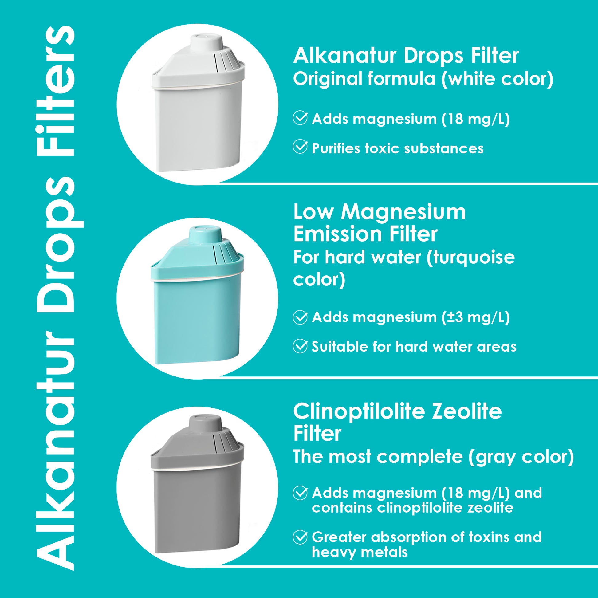 Upgrade your hydration with our revolutionary water filters. Want to try out our regular filters, our Low Magnesium Emission, AND our Zeolite ones? This variety pack is for you. These 3 replacement filters are for the Alkanatur water pitcher. You get one white, one green, and one grey. Our filters not only purify - they also alkalize, mineralize, ionize, and hydrogenate your tap water.