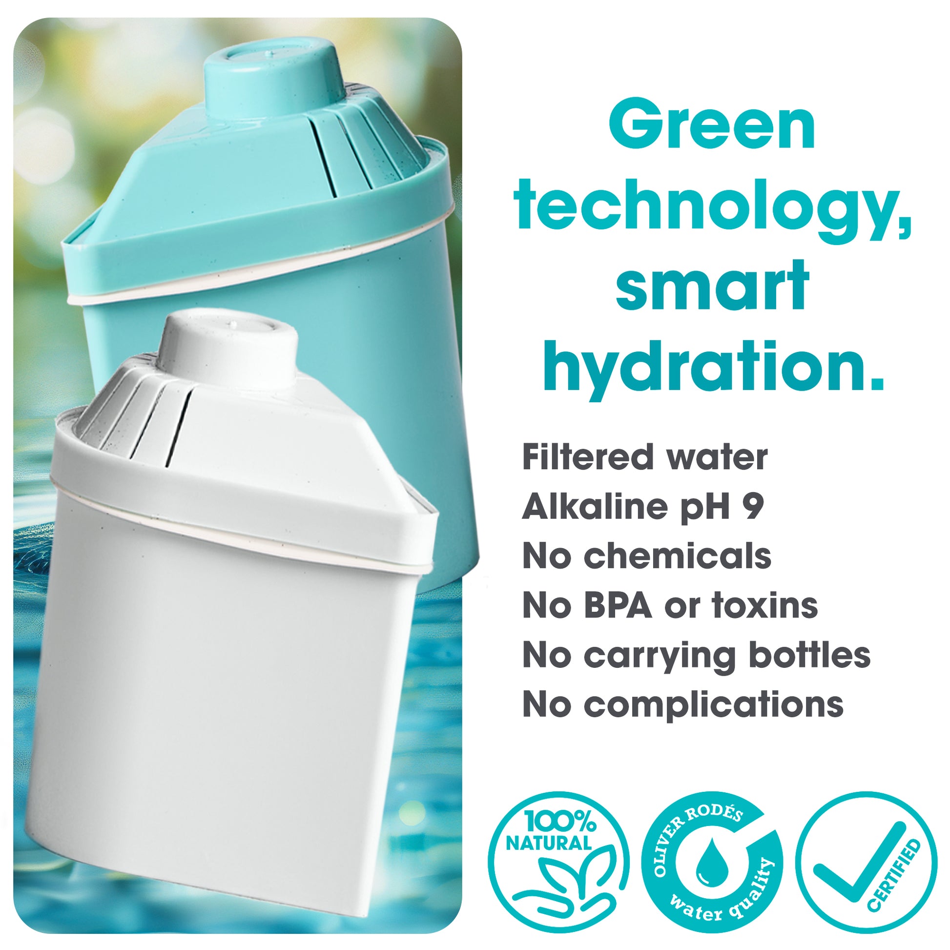 Our patented technology endows water with antioxidant potential which helps combat free radicals. For superior flavour, our white filters add in essential Magnesium, at a rate of 18mg per Liter - leaving you with balanced, antioxidant-rich water. If you find you're experiencing too much mineral build-up, switch over to the green filter. The green filter releases magnesium at a much lower rate, ideal for those who are transitioning from bottled water or for those living in areas with very hard water.