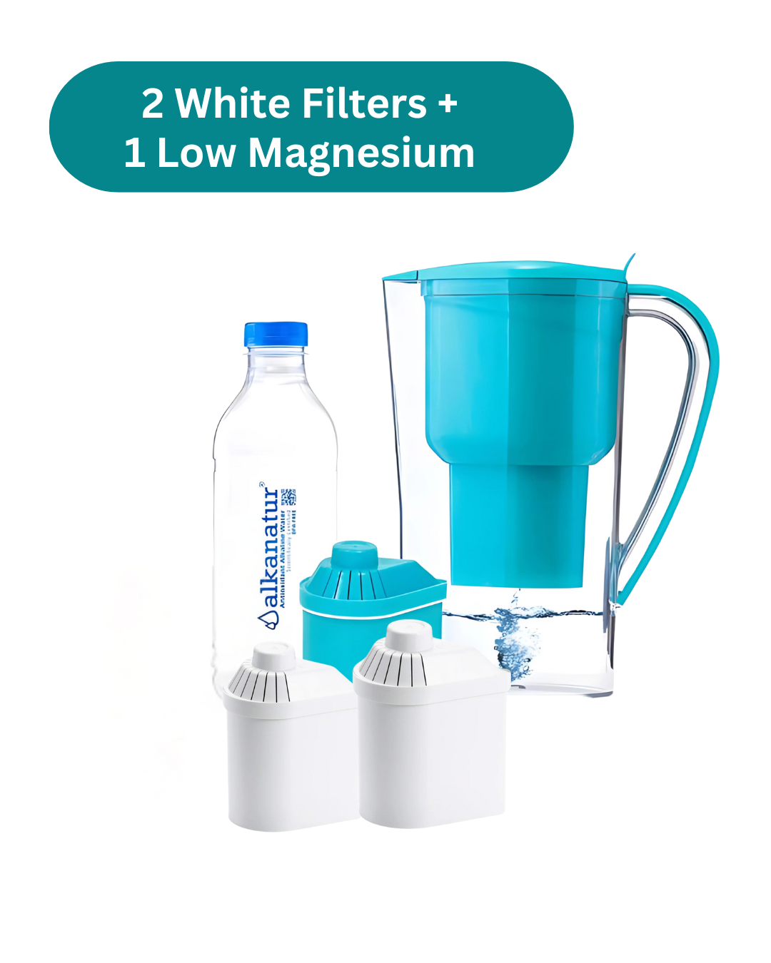 Mejora tu hidratación con nuestros revolucionarios filtros de agua. ¿Quieres probar tanto nuestros filtros regulares como nuestro filtro de baja emisión de magnesio? Este paquete combinado es para ti. Estos 3 filtros de repuesto son para la jarra de agua Alkanatur. Obtienes dos blancos y uno verde. Nuestros filtros no solo purifican, sino que también alcalinizan, mineralizan, ionizan e hidrogenan el agua del grifo. Nuestra tecnología patentada dota al agua de potencial antioxidante que ayuda a combatir los radicales libres. Para un sabor superior, nuestros filtros blancos añaden magnesio esencial, a una tasa de 18 mg por litro, dejándote con un agua equilibrada, saludable y rica en antioxidantes. Si notas que estás experimentando una acumulación excesiva de minerales , cámbiate al filtro verde. El filtro verde libera magnesio a una tasa mucho menor, ideal para quienes están haciendo la transición del agua embotellada o para quienes viven en zonas con agua muy dura. Ambos filtros tienen la misma capacidad de filtrado y capacidad alcalina, pero el filtro blanco producirá una mayor capacidad antioxidante, liberará más magnesio y proporcionará un agua con un balance mineral más alto.