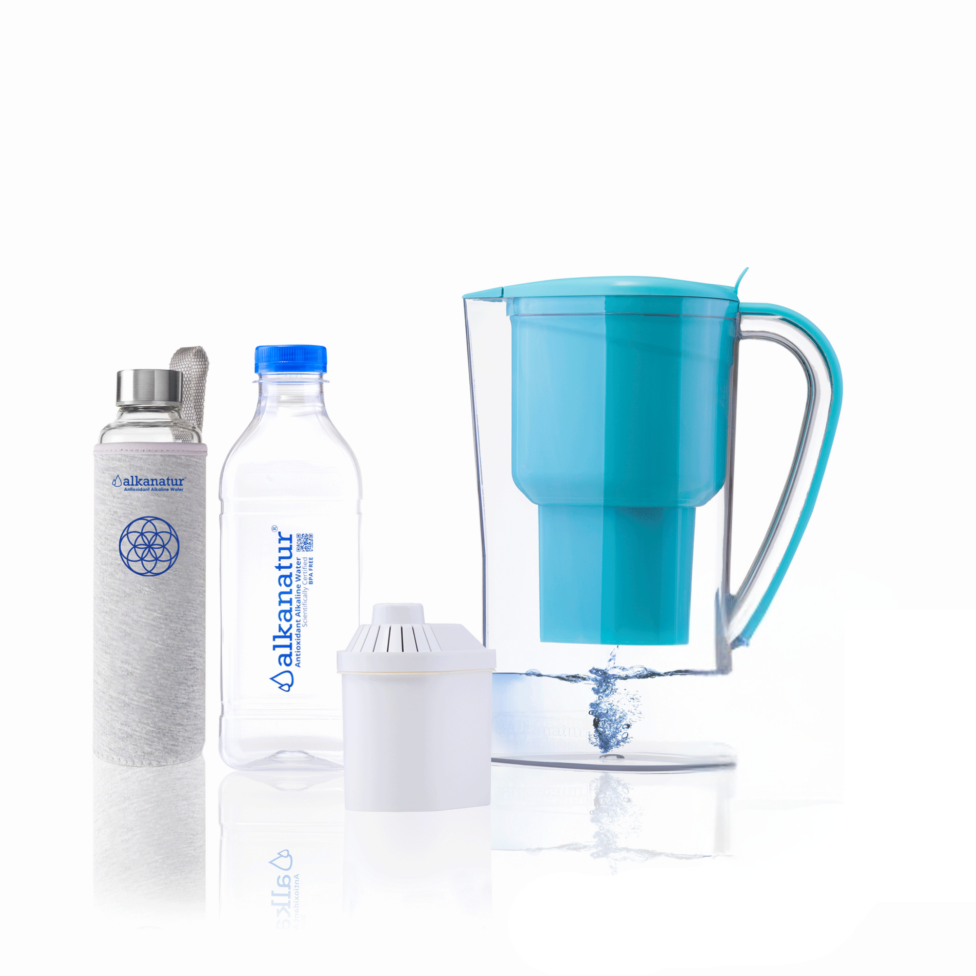 La Jarra de Alkanatur Alcaliniza, ioniza, hidrogena y purifica el agua. mientras agrega alta calidad magnesio (18 mg/L), retiene potasio en agua y elimina el exceso de calcio dando como resultado un agua equilibrada , fresca y deliciosa.